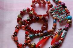 with glass, crystal, silver beads, leather, seeds, pods, plant fibers, etc.